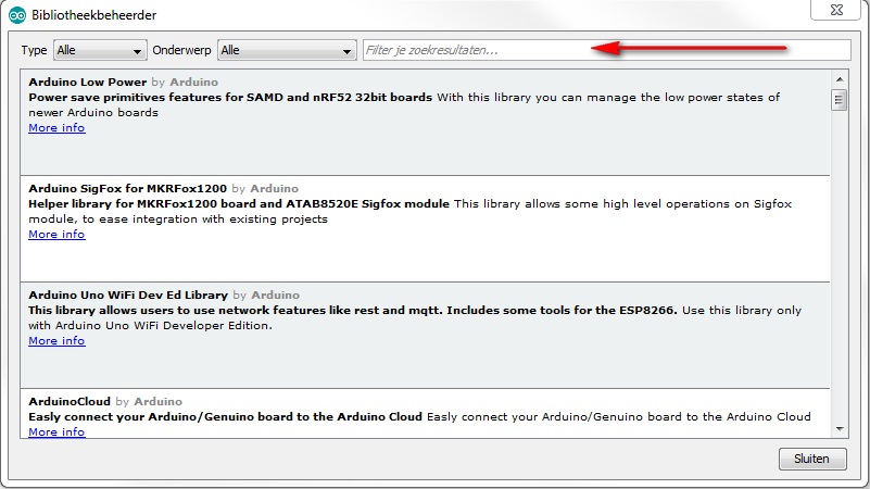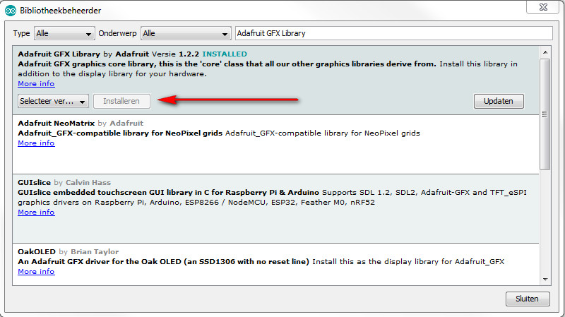 Vul in de zoekbalk de naam van de bibliotheek in, in dit geval beginnen we met Adafruit GFX Library.