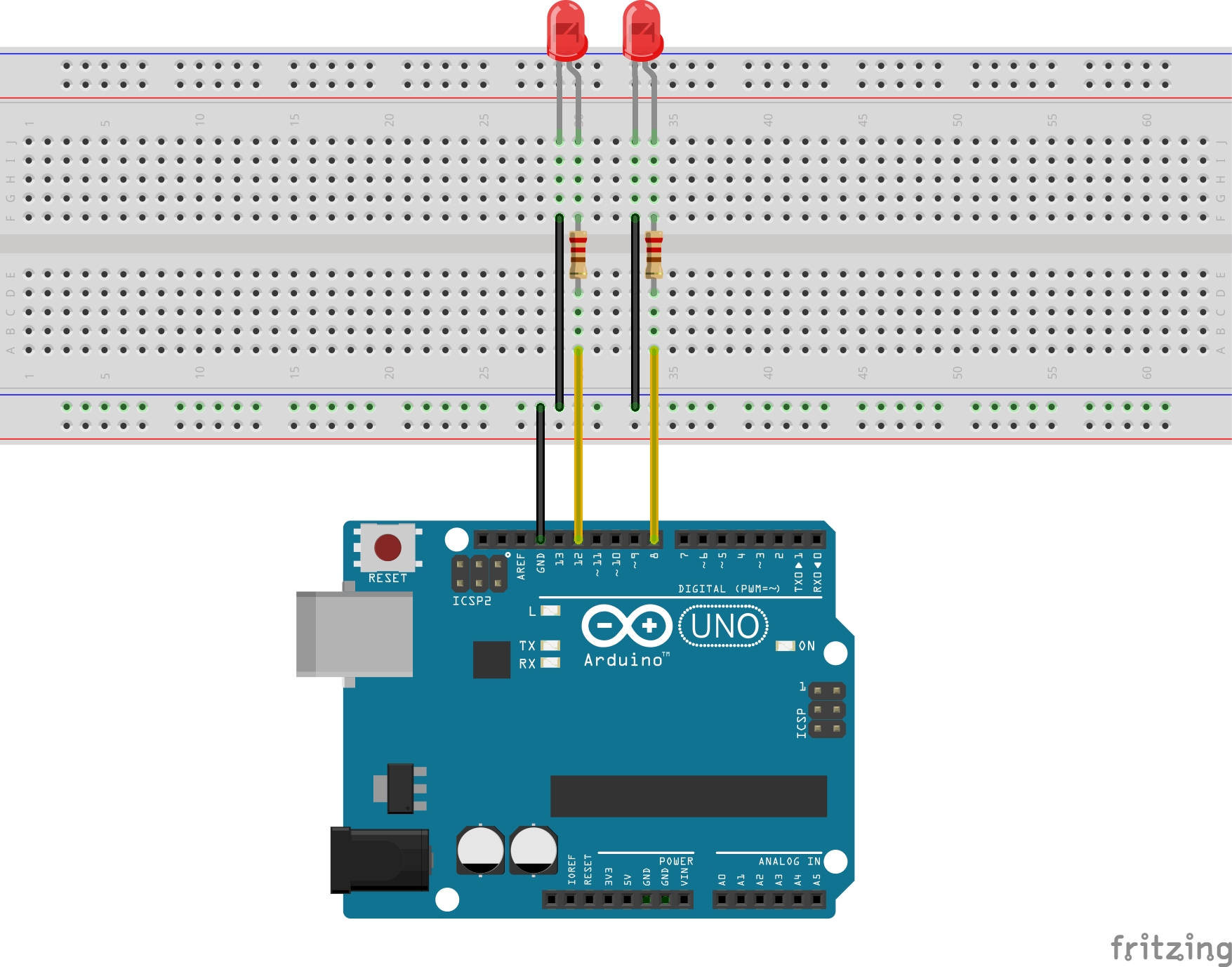 We zien nu de leds beide knipperen op verschillende snelheden.