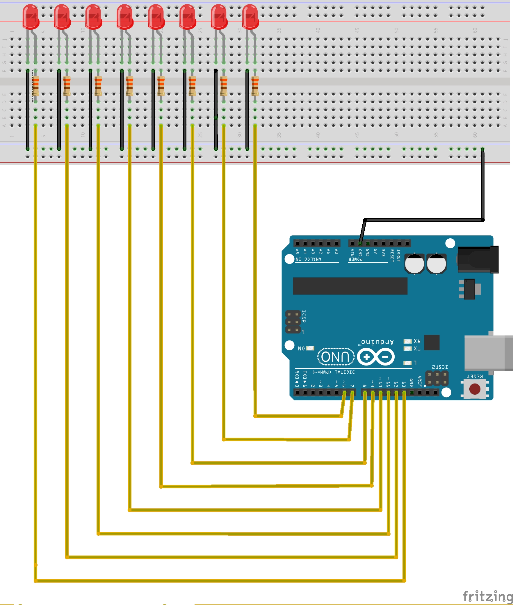 Probeer zelf het schema en het programma uit te breiden tot 8 leds.